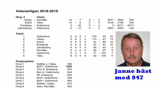 Vi och Vallentuna lyckades att ta oss till Väsby och spel i ligan denna snöiga och halkiga vinterdag. Sämre gick det för Enköping som fastnade i Bålsta pga en stor trafikolycka. Dom fick vända om hemåt. Matchen mot Vallentuna var en strid på kniven från första till sista slaget i sista rutan i sista serien. Efter 3 serier stod det 7-7 i matchen och chansen att det skulle bli oavgjort var stor. Men vår sista gubbe satte upp ett hål i sista rutan medan Vallentunas gubbe täckte i sista och till råga på allt tog dom totalen med en ynka poäng. Det tog dom till seger med knappa 10-9. Snopet och långnäsa. Annars hade det slutat oavgjort. Vi fick ihop 5801 i slagning och det är bra. Vallentuna hade hundra pinnar bättre. Bäst för dagen var en pigg Janne som strikade ihop hela 847.Sedan följde Jalle med 771, Åke 763, Peter 729 och Lasse 720. Övriga hade en mindre lyckad dag. Men det går flera tåg. Nästa match är mot Norrtälje i Täby om 2 veckor. Då är det vår tur att vinna. Summerat av en nöjd krönikör trots förlusten.