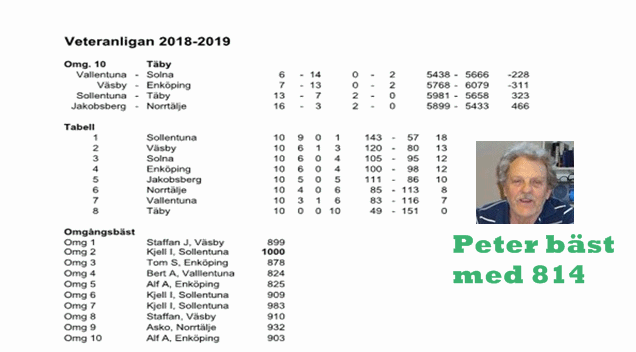Fredagens match mot Norrtälje vållade inga problem för Käglan som ledde matchen från start till mål. Vi vann alla serier och landade på fina 5899 och vinst med hela 16-3. En mycket gedigen laginsats den bästa på länge då vi hade hela 7 man över 700. En förarglig miss i sista slaget, annars hade alla varit över 700. Vilket inte hänt på år och dag. Bäst i matchen var Peter med fina 814. Peter och Janne vann också alla sina matcher. Sedan följde L-G med 760, Lasse 752, Klaus 732, Janne 728, Åke 720 och Jarl med 702. Ser lovande ut inför nästa svåra match mot Enköping i hemmahallen. Kanske den sista i Jakanhallen. Hoppas att många sluter upp och hejar fram våra veteranbowlare. Både krönikör och lagledare var nöjda med dagen.