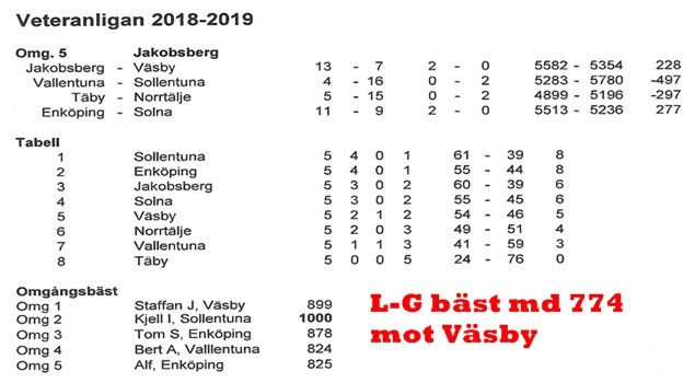 Sollentuna blev för svåra att rå på som vi misstänkte. Seriefavoriterna höll för trycket och vann enkelt över Käglan med hela 17-3. Vi kan bättre men denna dag var vi aldrig med i matchen. Klart godkänt till Åke och Peter som med 795 och 788 var dom enda över 700 i laget. Totalen 5440 är inte bra. Nästa match tar vi Solna om 2 veckor i Sollentuna. Den matchen skall vi bara vinna. Summerat av webmaster via Svenne.