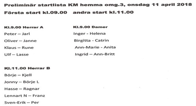 KM omg.3 spelas 11 april i hemmahallen där allt skall avgöras. Mest spänning hittar vi i Damklassen och Herrar B. OBS starttiderna.! Herrrar A och Damerna startar redan kl.09.00 och Herrar B kl.11.00. Kan ev. tillkomma några ändringar i sista stund i startlistan. Lycka till alla med spelet. De som inte spelar KM kan träna på de banor som är lediga.