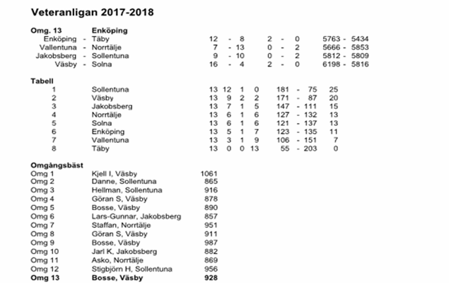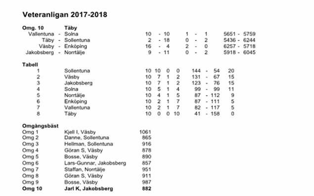 Väsby är alltid på förhand en svår match, det visste vi. Och det besannades också. Vi hängde dock med skapligt i 3 serier. Vi låg under med 6-9 inför sista serien hade en liten möjlighet till någon poäng. Men där tog det hela tvärstopp. Dom körde över och mosade oss totalt i sista med hela 5-0. Några hos oss hade inte sin bästa dag kan man säga. Peter däremot håller stilen och var bäst med fina 804. Sedan följde Åke med 760, L-G med 746 och Lasse med 709. Totalen stannade på 5458. Vi kan bättre än så, kanske redan till nästa match mot Sollentuna i Enköping om 2 veckor. Hoppas då att alla är friska och kan ställa upp. Summerat av en frånvarande webmaster. PBK Käglan Järfälla 10 mar 2018 4kommentarer