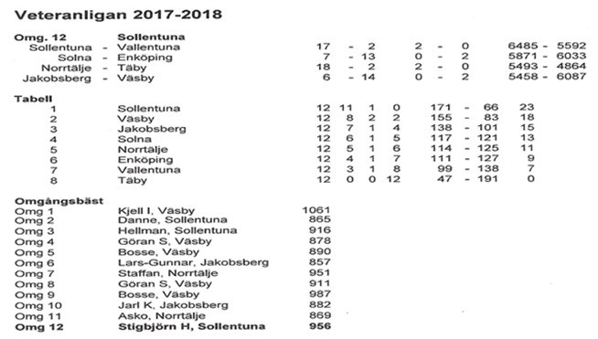 Matchen hemma mot Enköping går inte till historien som den roligaste som spelats i Jakanhallen. Spelglädjen försvann redan efter första serien efter 1296 som resultat. Någon hade tydligen bestämt att lägga på en 'annorlunda' profil som sänkte humöret på alla lagen som spelade i hallen under dagen. Resultaten låg från 5000-5700 vilket inte är vanligt när lagen spelar i andra hallar. Hoppas detta inte upprepas nästa gång veteranligan spelar i Jakanhallen. Nu till vår match. Inte varje dag alla i laget går under 700. Vi låg mellan 600-696. Det säger allt om banunderlaget. Totalen 5330 är också säsongslägsta. OBS att 696 var högst hos oss och det var Ulf. Matchen slutade med en svidande förlust med 9-11. Ingen tillfällighet att alla lagen gick mycket sämre än vanligt på detta banunderlag. Nu ser vi framåt mot nästa match i Sollentunahallen och få spelglädjen tillbaka på normala banor. Dom flesta hallar anpassar sina banor med profiler när veteraner spelar. Denna dag var det inte någon fördel att vara hemmalag. Många besvikna spelare lämnade Jakanhallen denna dag. Krönikör denna dag webmaster. PBK Käglan Järfälla 24 feb 2018 0kommentarer