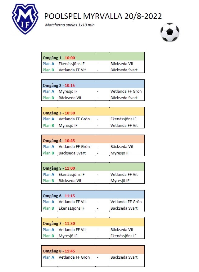Hej! Här kommer morgondagens spelschema. Ser ut att bli spel mellan kl. 10-12. Vi ses imorgon 09:15 på A-Plan 😊 //Tränarna Nicklas & Erica PF 14/15 19 aug 2022 0kommentarer