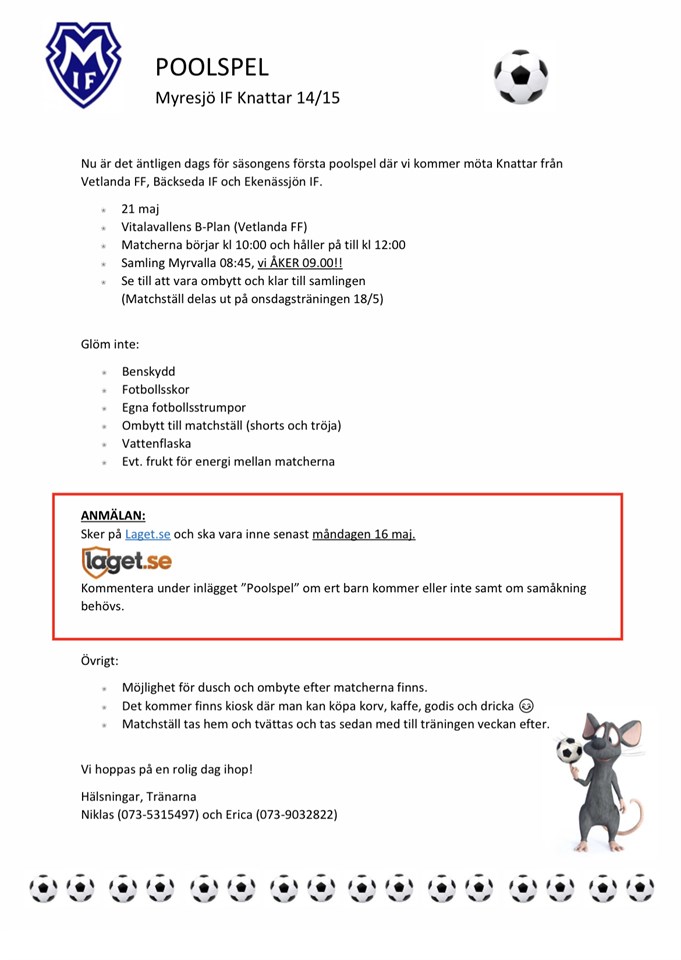 Idag fick barnen med sig en lapp hem gällande Poolspel 21/5. Lägger även ut informationen här. Senast anmälan är måndag 16 maj och görs här nedan i kommentarerna. Vi hoppas så många som möjligt kan deltaga. Hälsningar, Ledarna Niklas och Erica PF 14/15 11 maj 2022 16kommentarer
