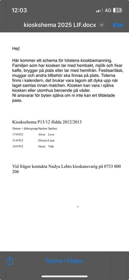 Jag kan ta kiosken på söndag! Så kanske Alvar och Vide kan byta pass? Om ni tar 14/9 istället Jessica? Någon som vet om det finns swishskylt och prislista? Sist jag hade kiosken, tror det var sista hemmamatchen innan sommaruppehållet, fanns det inget. Hittade inte ens papper och penna att skriva egna skyltar med 😅