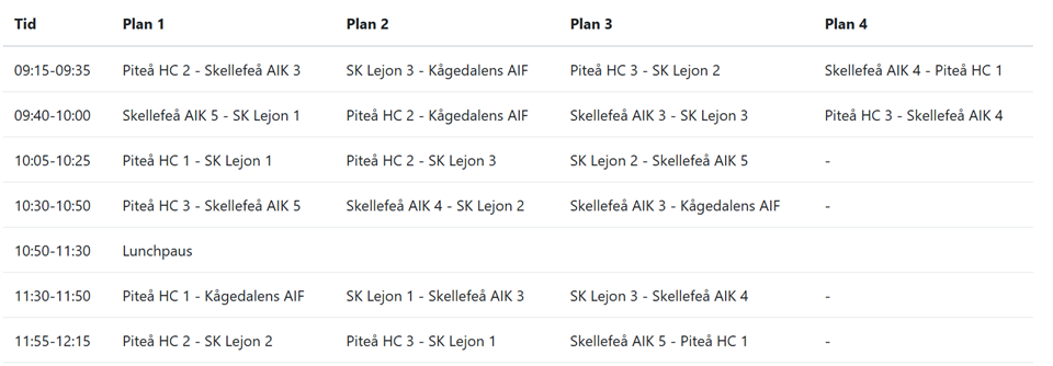 Samling 20 minuter före första matchen, vilket då borde bli 08.55