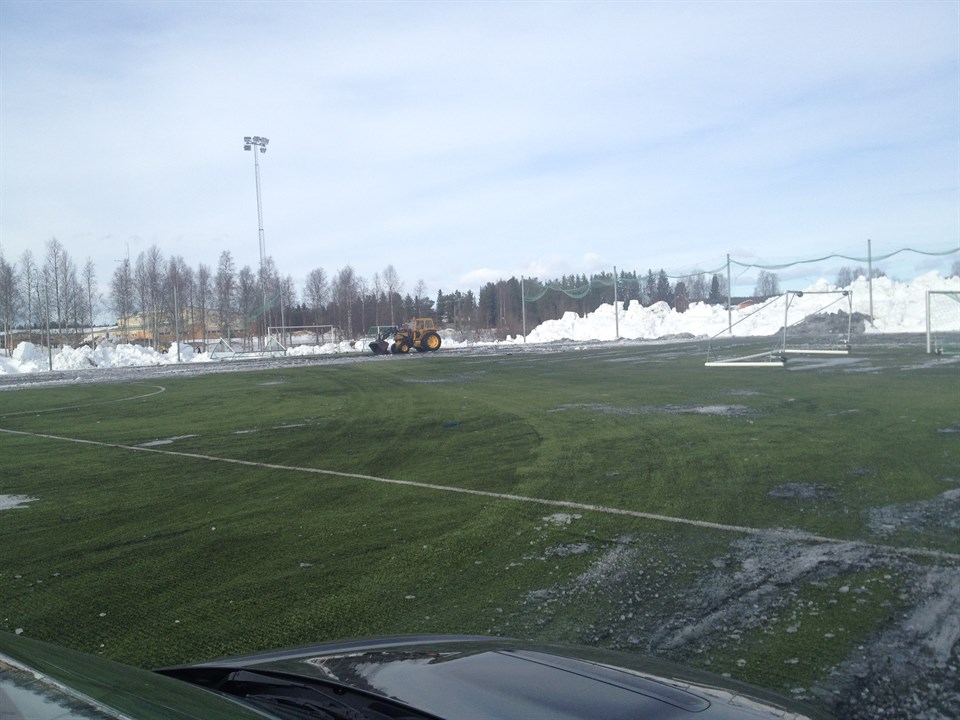 Nu börjar det likna nåt. Sladden plogade medan Tomme och Stefan sladdade... Visserligen har redan Liam och Gum San redan kickat på Riavallen men på onsdag 2/4 kan nog större delen av plan användas. Skyddsnäten å sånt kommer på plats senare i vecka 14. De planerade matcherna till helgen bör kunna genomföras. Pajala IF 29 mar 2014 0kommentarer