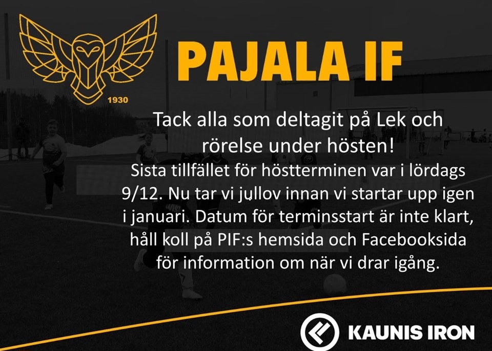 Sista tillfället för Lek och Rörelse var den 9/12. Aktiviteten har uppehåll under jul och nyår, drar igång igen i januari. Pajala IF vill tacka alla barn och föräldrar som deltagit! Pajala IF 15 dec 2023