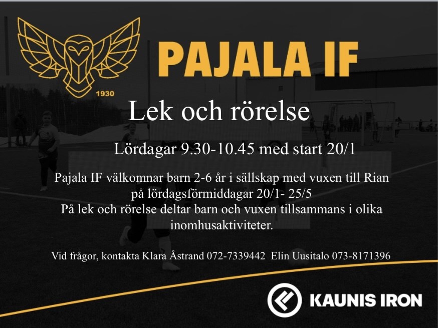 Pajala IF välkomnar barn 2-6 år i sällskap med vuxen till Rian på lördagsförmiddagar 20/1- 25/5. På lek och rörelse deltar barn och vuxen tillsammans i olika inomhusaktiviteter. Medlemsavgift ska betalas av alla som tränar med Pajala IF. Medlemsavgiften är 100 kr per person eller 200 kr för familj och betalas direkt till Pajala IF. Bankgiro 758-5524 Swish 123 346 43 36 Märk betalningen: Medlemsavg namn på spelaren eller namn på alla familjemedlemmar Pajala IF 11 jan 2024