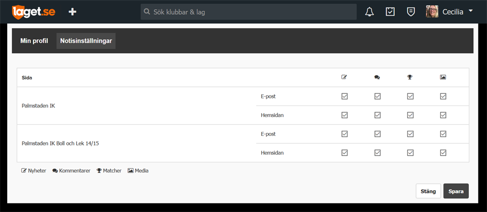 Klicka ur/i rutorna för notiser som du vill få ut