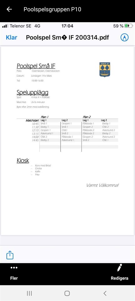 Godkväll. Vi ändrar om själva i spelschemat så Pålsboda 1 spelar kl 10:45 och kl 12:15 Pålsboda 2 spelar kl 13:15 och kl 14:00 Samling pålsboda 1 kl 10:00 i odensbacken Samling pålsboda 2 kl 12:30. Pålsboda 1 Jesper Felix Hampus Wilmer Ludwig Rasmus Åke Love Pålsboda 2 Jesper Emil Ville Noel Jonathan Wilhelm Edwin Hannes Mvh Ledarna 10/11 10 mar 2020 1kommentar