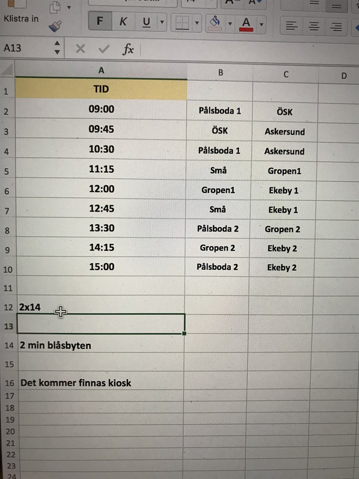 Sådär då har vi fått det mesta klart vad gäller barn inför lördagens poolspel. Så på förmiddagen spelar Ludwig Ville Vilhelm Knut Nils Rasmus Felix Wilmer Vi träffas i hallen kl 08:00 för att förbereda alltihop. Vi ser 1 förälder per barn av dom som ska spela på förmiddagen på plats mellan kl 8:00 - 12:00 Så hjälps vi åt att plasera ut oss på olika uppgifter. På eftermiddagen spelar Edwin Emil Hampus Hannes Jonathan Åke Love Jesper Samma där 1 förälder per barn mellan kl 12:00 - 16:30 ca som hjälper till med poolspelet. Mvh Ledarna 10/11 14 jan 2020 1kommentar