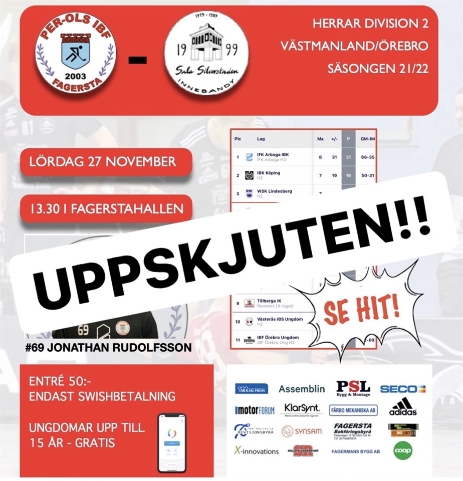 Dagens match mot Sala är uppskjuten pga covid-19 och den ökade smittspridningen i länet. Nytt speldatum kommer inom kort. På återseende!