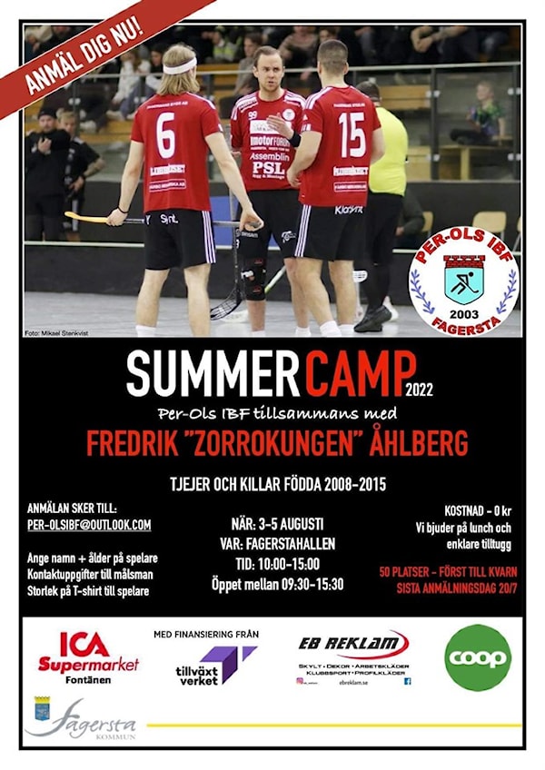 Första veckan i augusti kommer en summercamp att äga rum i Fagerstahallen. Kom och träffa föreningens seniorspelare, träna tillsammans med innebandyprofiler och kanske vågar du utmana Fredrik Åhlberg i en zorrotävling? Helt enkelt en heldag fylld med innebandy!