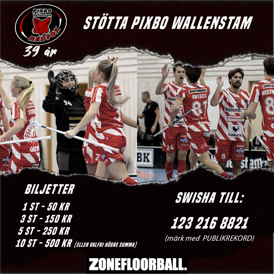 Stötta Pixbo Wallenstam Inställda matcher och ett slutspel som i första hand skjutits upp för våra, redan slutspelsklara, dam- och herrlag. Matcher och slutspel som för föreningen är oerhört viktiga, inte bara rent sportsligt utan också ur en ekonomisk synpunkt. Förlorad inkomst som är viktig för att driva föreningens verksamhet framåt. Fredagen den 20:e mars fyller Pixbo Wallenstam hela 39 år. I samband med detta vill vi slå ett nytt publikrekord. Vi gör därför ett krafttag tillsammans med vår huvudpartner Zone att fiktivt fylla hallen och slå vårt publikrekord. Vårt mål och förhoppning är att fiktivt fylla hallen med över 2000 personer i publiken. Biljetter: 1 st 50:- 3 st 150:- 5 st 250:- 10 st 500:- (eller valfri högre summa) Du swishar in på 123 216 8821 (Pixbo Wallenstam), märk betalningen med PUBLIKREKORD! Bland de som köper biljett kommer vi tillsammans med Zone lotta ut 10 stycken som får ett presentkort på 1.000 kr att använda på innebandyutrustning. Ni som dessutom väljer att swisha 500 kr eller mer får 10 fribiljetter till valfri grundspelmatch nästa säsong! Vi i Pixbo Wallenstam vill på förhand tacka för allt stöd. Tillsammans ska vi och hela samhället gå stärkta ur detta!