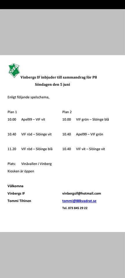 Godmorgon alla härliga fotbollsföräldrar Det är sammandrag på Vinbergs IF igen den 5/6. Samling kl 9.30 och sista match för oss är 11.20. Vilka kan vara med och spela? Ha en fin dag vidare😊🌞 PF-14/15 27 maj 2022 0kommentarer