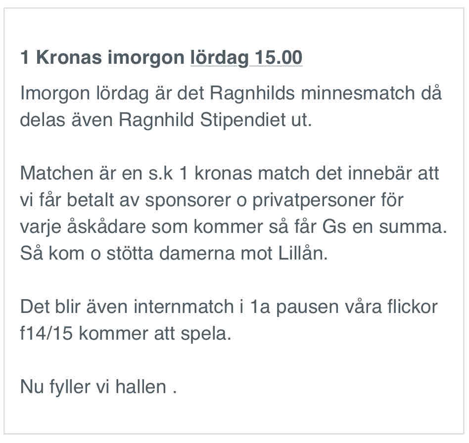 I morgon lördag anordnar GS enkronasmatch när damlaget tar emot Lillån. Det brukar vara en rolig tillställning med flera aktiviteter utöver själva matchen. Såklart är det viktigt för föreningen med många besökare. Kom gärna till hallen, heja och stötta föreningen, eller skicka i vart fall dit grabbarna! Pojkar 11 23 feb 2024 1kommentar