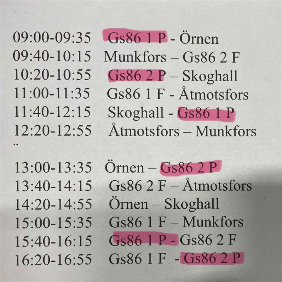 Hej, I bifogad bild finns lördagens spelschema med markering för våra matcher. Vi ställer upp med två lag med två femmor i varje, så det blir mycket speltid. Ni som inte har svarat på kallelsen än behöver göra det snarast, så vi kan få ordning på lagindelning och arbetspass. När det gäller bemanning av sekretariat, kiosk mm så delar vi detta med tjejlaget. Schema kommer inom kort.