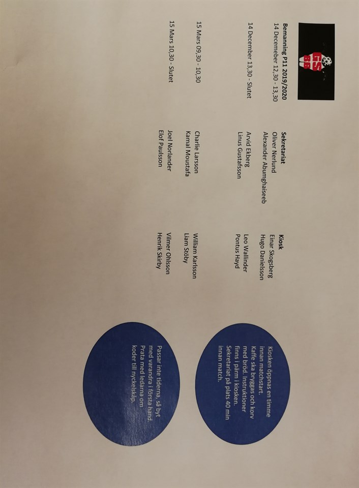 Hej på er! För det första vad gällande poolspelet vara eller icke vara så följer vi Svenska Innebandys rekomendationer se https://www.innebandy.se/inlaegg/lista/information-gallande-coronaviruset-1/ Följer man Folkhälsomyndigheten så kommer vi att anordna poolspel nu på söndag den 2020-03-15 klockan 9:30. Nu till en annan nyhet! Vi vill även påminna om bemanning av kiosk mm till poolspelet. Se bild. Vissa av de som nu har arbetspass har inte varit med på ett tag. I början av säsongen (i samband med föräldramötet) kom vi överens om att den som tilldelats ett pass ansvarar för att hitta ersättare vid förhinder. Vi hoppas att detta går att lösa inom föräldragruppen utan att vi ledare behöver lägga oss i. Utdrag ur minnesantekningarna från föräldramötet 2019-10-19 se nedan. Gällande åtagande t.ex. kioskpass som man fått tilldelat så äger man själv problemet. Kan man inte så byter / säljer man passet. Vid byte av pass eller ändring av pass skriv det i den här tråden. Vi måste hjälpas åt med detta för tillsammans är vi laget. MVH Tränarna. . Pojkar 11 11 mar 2020 3kommentarer