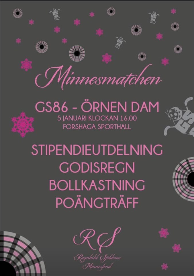 Söndagen den 5/1 kl 16.00 spelar GS 86 damlag derby mot SK Örnen i Forshaga sporthall. Matchen är till minne av eldsjälen Ragnhild Sjöblom och full hall med härlig stämning är att vänta! Våra killar i P11 har fått äran att springa in hand i hand med hemmaspelarna inför matchen. Vi hoppas att så många som möjligt tar chansen till en kul upplevelse, samtidigt som vi stödjer vår fina förening. Följande gäller: - Samling i Forshaga sporthall kl 15.30 - Klädsel: matchställ (utan klubba). - Spel med klubba är endast tillåtet under pauserna och bara på planen. - Kallelse kommer. Svara på den så fort som möjligt så att vi kan planera. Alla är förstås välkomna att stanna och heja på vårt damlag! Vi vill också passa på att förtydliga att vi tränar under hela jullovet. Kallelser kommer som vanligt via laget. God jul önskar ledarna! Pojkar 11 23 dec 2019 0kommentarer