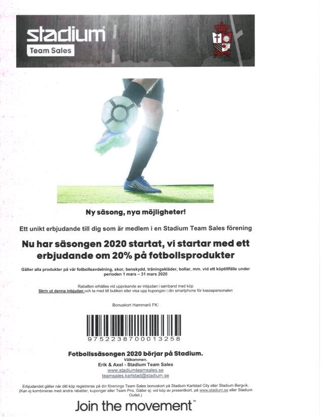 Hej! Nu står våren för dörren, och fotbollssäsongen närmar sig med stormsteg! Här kommer årets fotbollskupong (giltig från 1-31 mars!) Skriv ut inbjudan eller visa upp kupongen i din telefon för kassapersonalen. Kupongen gäller på ett helt fotbollsköp, både på Stadium Bergvik och Karlstad City. Ha det gott! Helle Johansson Kanslist Hammarö FK