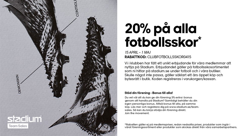 Hejsan! Butikerna och stadium.se är fulladdade med säsongens nyheter och denna kupong ger era medlemmar 20% rabatt på fotbollsskor under perioden 15/4-1/5. Kupongen gäller både i butik och online. För beställningar på stadium.se skriver ni in rabattkoden och i butik visar ni upp kupongen i kassan. Kupongen registreras inte på föreningen utan de som handlar kan registrera köpet på sitt eget stadium-kort. Klicka på bilden och spara/skriv ut eller visa mailet i kassan Välkomna in Stadium Teamsales P 13 (P-2011) 14 apr 2021 0kommentarer