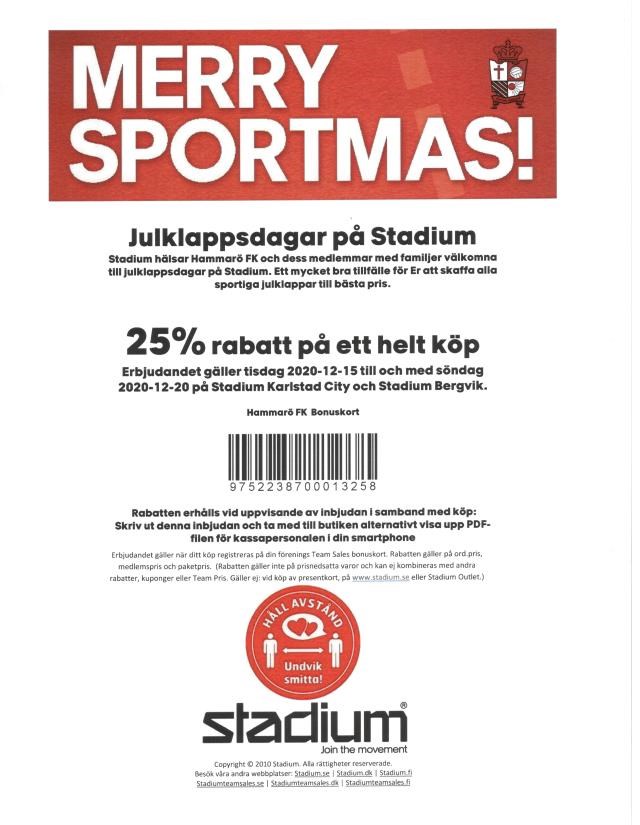 Hejsan! Stadium vill önska Er medlemmar en God Jul genom att ge Er en julkupong som ger 25% rabatt på ett helt köp. Kupongen gäller 15-20/12 i City-butiken och på Bergvik. Alla köp som görs med denna kupong är bonusgrundande för föreningen. Med andra ord = Fria bonuspengar till föreningen! Kupongen skrivs ut eller visas upp som PDF i smartphone i kassan. OBS! Vi vill uppmana alla att hålla avstånd och inte besöka butiken om man känner sig minsta krasslig. Då detta inte är en kampanj som görs centralt kan den inte göras digitalt, utan denna gör vi tillsammans med butikscheferna på Bergvik och i City unikt för er. God Jul! Daniel Axelsson Stadium Team Sales P 13 (P-2011) 8 dec 2020 0kommentarer