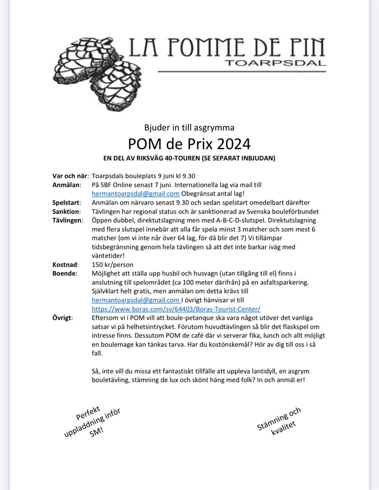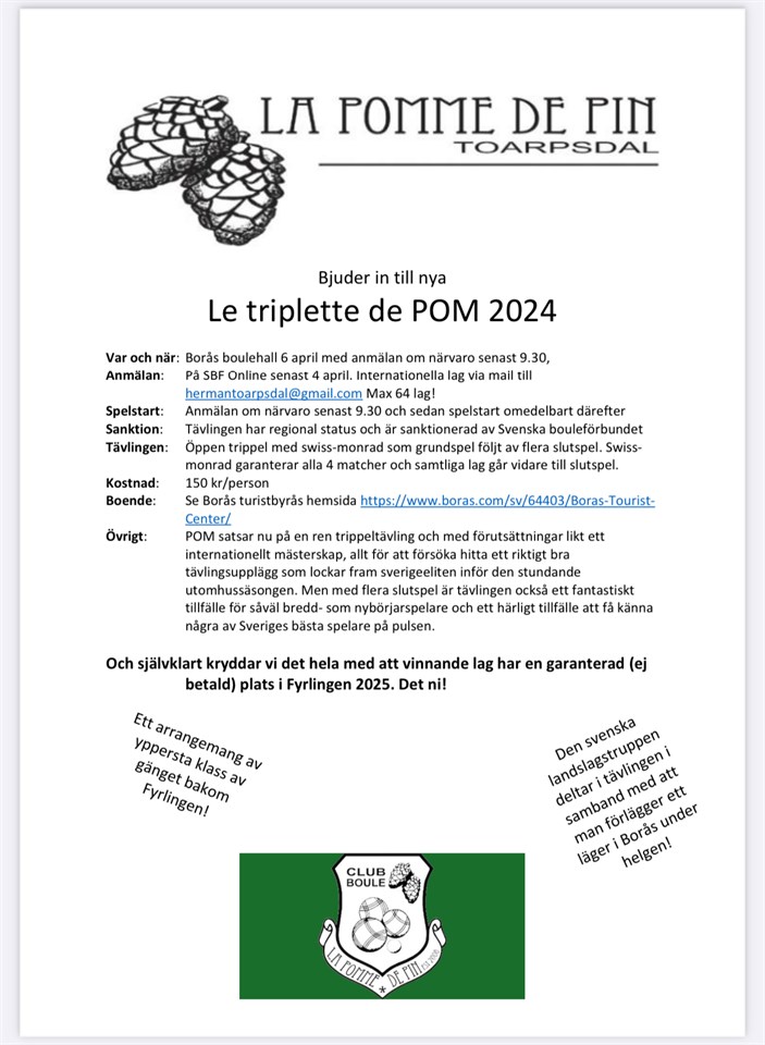 Här nedan finns de anmälda lagen till Mixedtrippel DM för POM. Man Kan även gå in på länken nedan för att se alla anmälda lag till de olika klasserna. Anmälda lag V65: Thomas Andersson, Inga-Britta Carlsson, Jan-Olof Carlsson Erja Lehtonen, Anne Gustavsson, Jan Lehtonen Leif Mollberg, Gerd Tunje, Bertil Tunje Jan-Olof Caspersson, Mona Larsson, Monica Rydell Öppen: Roger Smedenfeldt, Carina Stenborg, Lars Stenborg Annica Bergström, Johan Nilsson, Herman Thorell Fredrik Hirverud, Carina Sutt, Felix Särén Robert Björkebro, Leif Mollberg, Birgitta Thorell Thomas Andersson, Bengt Karlsson, Christina Karlsson Stefan Gustafsson, Alexandra Järlefjord, Robin Nilsson Hans-Göran Bengtsson, Peder Järlefjord, Katarina Olbäck Sundberg Anne Gustavsson, Bernt Olsson, Paul Sundberg V55: Hans-Göran Bengtsson, Bertil Tunje, Gerd Tunje Roger Smedenfeldt, Lars Stenborg, Carina Stenborg Thomas Andersson, Peder Järlefjord, Monica Rydell Anne Gustavsson, Leif Mollberg, Bernt Olsson Annica Bergström, Robert Björkebro, Carina Sutt Erja Lehtonen, Jan Lehtonen, Paul Sundberg Inga-Britta Carlsson, Jan-Olof Carlsson, Katarina Olbäck Sundberg