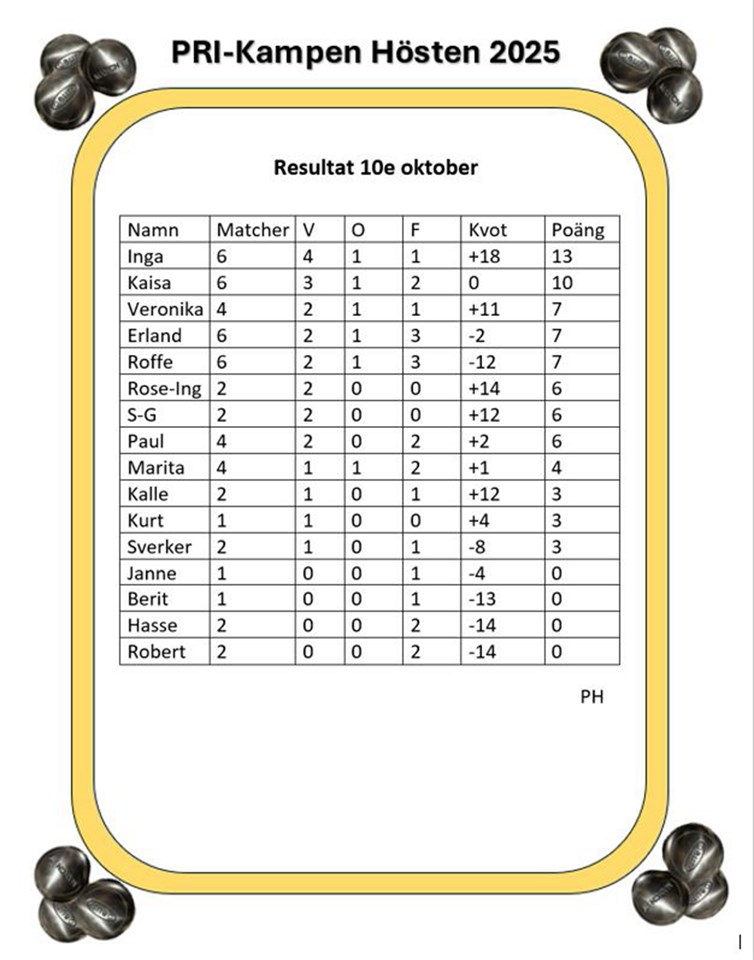 Resultat 251010 Prins Bertils Bouleclub 14 okt 0kommentarer