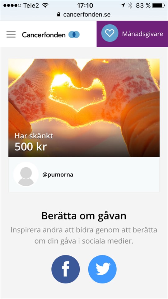 @pumorna skänker 500 sek till Cancerfonden ❤️? Vi uppmanar också andra klubbar, idrottsföreningar och korplag att göra detsamma. Kan vi - så kan ni! #tillsammansmotcancer #fuckcancer Pumorna 10 jan 2017 2kommentarer