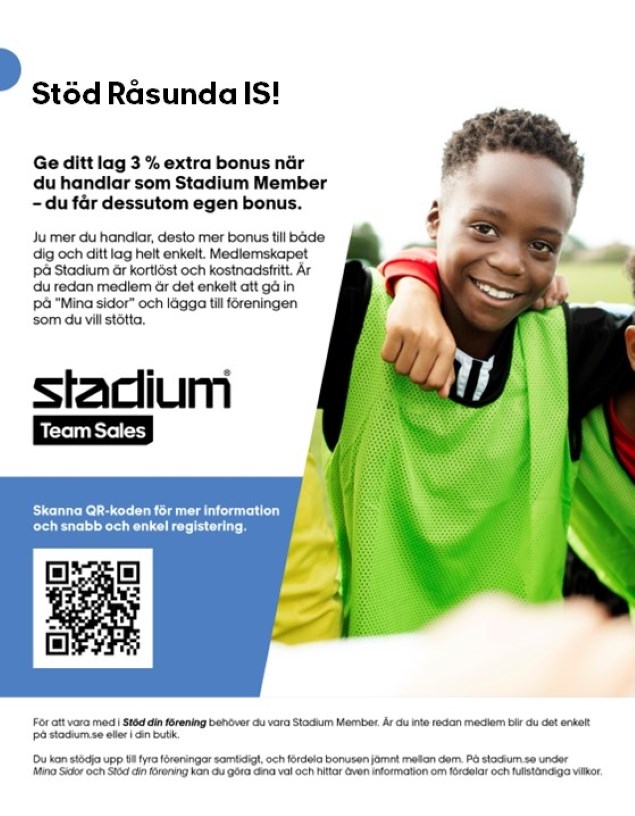 Hej på er, var med och stöd Råsunda IS Man klickar på länken och väljer Råsunda IS så ger man 3% bonus på allt man handlar ur Stadium ordinarie sortiment till Råsunda IS samtidigt som man behåller all sin egna bonus som vanligt. Så det är win-win för alla helt enkelt.
