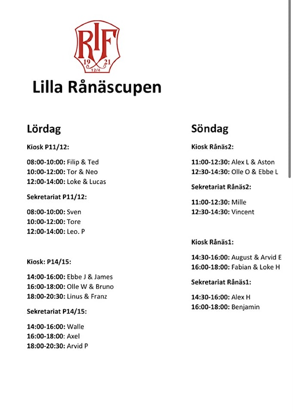 Arbetsschema Lilla Rånäscupen