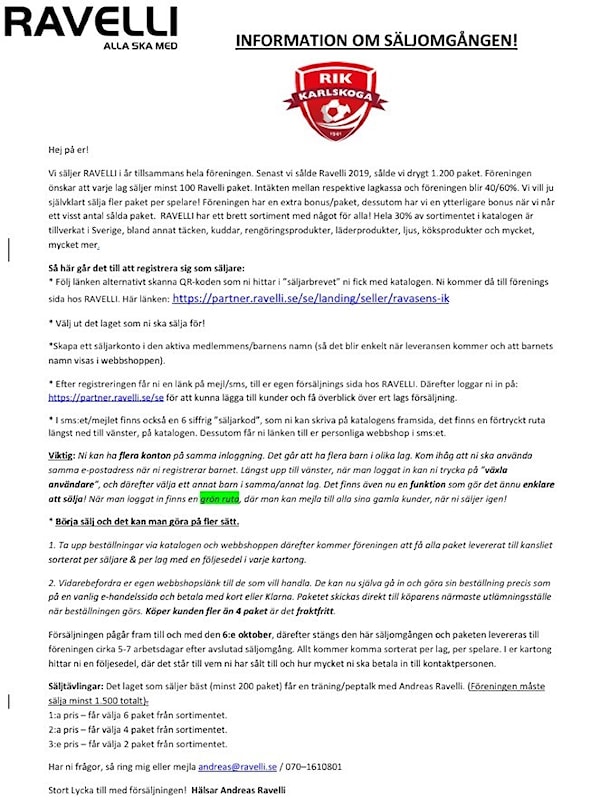 Med början imorgon på träningen kommer vi dela ut kataloger så att ni kan starta er försäljning. Vill ni smyga igång utan katalog och dela webshop på sociala medier eller liknande går det såklart bra. Då går ni in på följande länk  Registrera säljare Ravelli ni väljer F15 och skapar ett konto i barnets namn. Man kommer också till registreringen om man scannar QR-koden som följer med katalogen ni får hem. Har ni barn i flera lag skapar ni separata konton som ni själva sedan kan växla mellan.