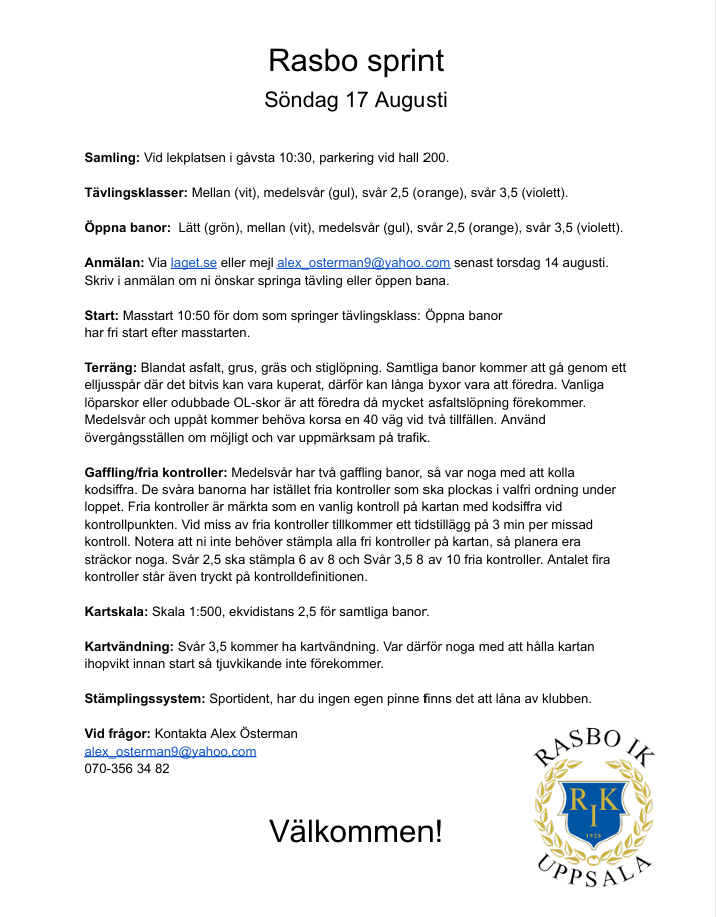 Här kommer PM till Rasbo Sprinten som är på söndag. Anmälan är öppen till på torsdag, så in och anmäl dig om du inte redan gjort det! Det finns banor i alla nivåer. Vid frågor är det bara att höra av sig! alex_osterman9@yahoo.com