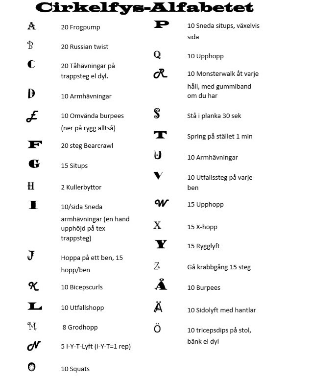 Idag skulle roslagsbroloppet gått av stapeln. Friidrottssektionen, och även vi i gymnastiksektionen, hoppas att så många som möjligt springer en runda idag och delar en kommentar, ditt gps spår eller en bild på dig själv när du springer på. https://www.facebook.com/roslagsbroloppet/ För er som inte vill eller kan springa kommer här ett alternativ. Cirkelfys-alfabetet. Gör en övning för varje bokstav i ROSLAGSBROLOPPET, gärna flera varv. Dela gärna på https://www.facebook.com/groups/256380721059603/ Tabata/Cirkelfys på facebook. Lycka till! Gymnastiksektionen Tabata/Cirkelfys RIF 19 apr 2020 0kommentarer