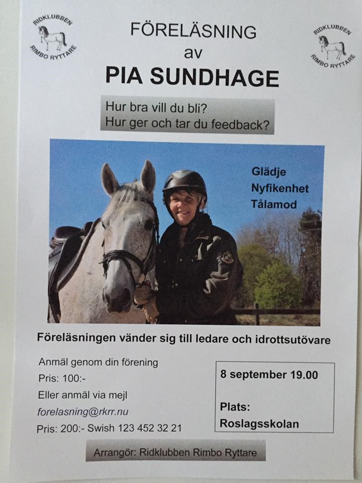 Torsdag den 8 september är det en föreläsning med Pia Sundhage på Roslagsskolan. Gör ni anmälan via klubben, d.v.s. meddelar Jonas Hallsten, så kostar det 100 kr. Annars är priset 200 kr. Klubbens anmälan skickas in måndag den 22/8.