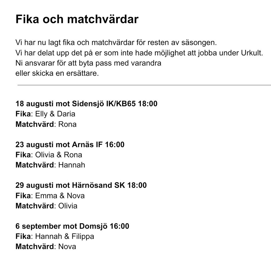 Här kommer fika och matchvärdsansvar för de sista hemmamatcherna denna säsong. F-11 10 aug 2025 0kommentarer