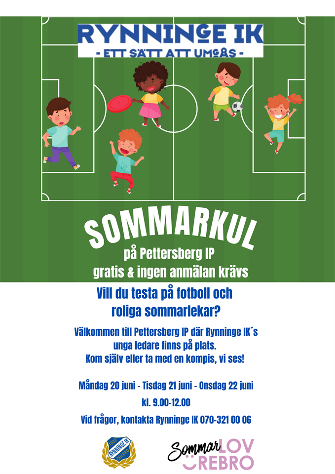 Äntligen sommarlov! 😊 Det betyder att alla är välkomna på Sommarkul på Pettersberg IP. 20-22 juni kl.9.00-12.00 får du spela fotboll och göra roliga sommarlekar tillsammans med Rynninge IK´s unga ledare. Hoppas vi ses! /Styrelsen PU 15/16 15 jun 2022 0kommentarer