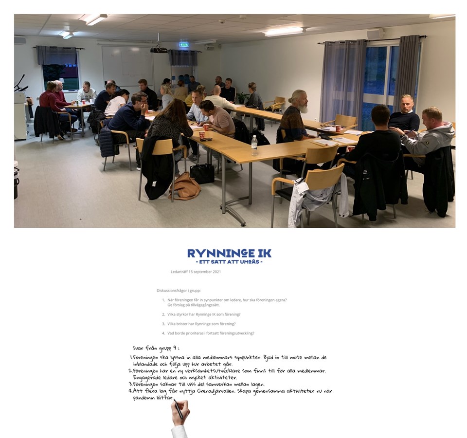 Igår träffades föreningens ledare på Grenadjärvallen för en kväll med fokus på var föreningen är idag och gemensamma mål. Det var meningsfulla samtal under kvällen och en god stämning. Under kvällen så räknades det fram att ni tillsammans besitter 98 års ledarerfarenhet, det är Rynninge IK stolta över! Tack alla ledare för allt ni gör för medlemmarna. PU 15/16 16 sep 2021 0kommentarer