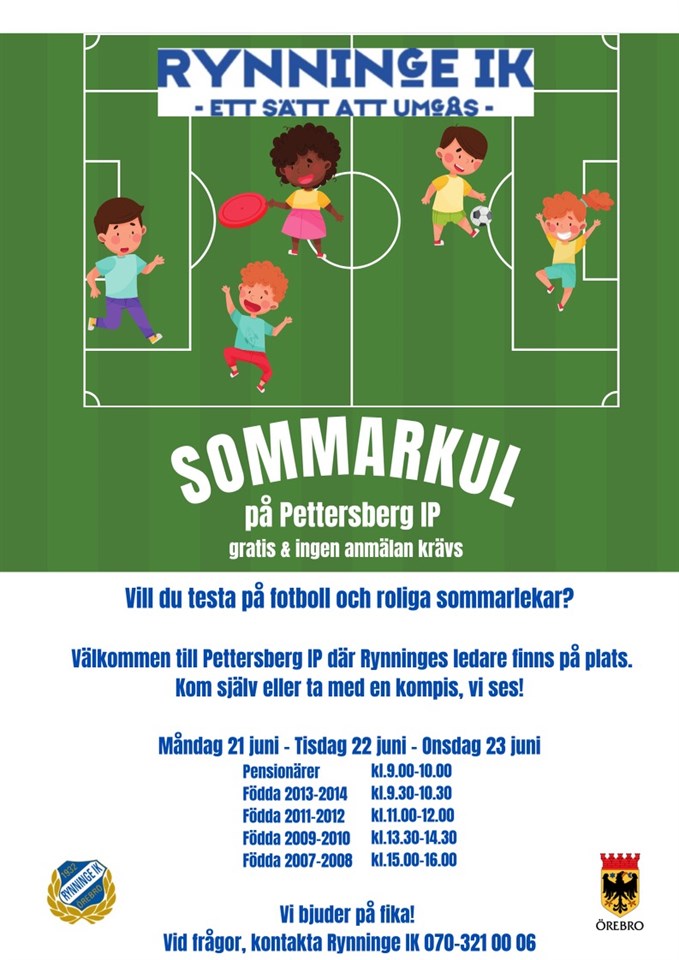 SOMMARKUL på Pettersberg IP gratis & ingen anmälan krävs Vill du testa på fotboll och roliga sommarlekar? Välkommen till Pettersberg IP där Rynninges ledare finns på plats. Kom själv eller ta med en kompis, vi ses! Måndag 21 juni - Tisdag 22 juni - Onsdag 23 juni Pensionärer kl.9.00-10.00 Födda 2013-2014 kl.9.30-10.30 Födda 2011-2012 kl.11.00-12.00 Födda 2009-2010 kl.13.30-14.30 Födda 2007-2008 kl.15.00-16.00 Vi bjuder på fika! Vid frågor, kontakta Rynninge IK 070-321 00 06 PU 15/16 14 jun 2021 0kommentarer