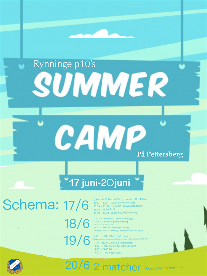 Nu har vi ett uppdaterat schema. Som allt annat med laget vill vi självklart att alla ska vara med så mycket som möjligt. Alla barn kommer klädda i Rynningekläder. Alla barn har med sig kall lunch (och bestick om maten kräver det) som vi äter ihop på Pettersberg mellan passen. Under den fria tiden är det inte säkert att vuxna är där hela tiden. Barnen får gärna ta med sig kortlekar eller liknande för lite lugna aktiviteter mellan passen. Vi kunde tyvärr inte ordna med övernattning denna gång. In och anmäl era barn! PU 15/16 11 jun 2021 0kommentarer