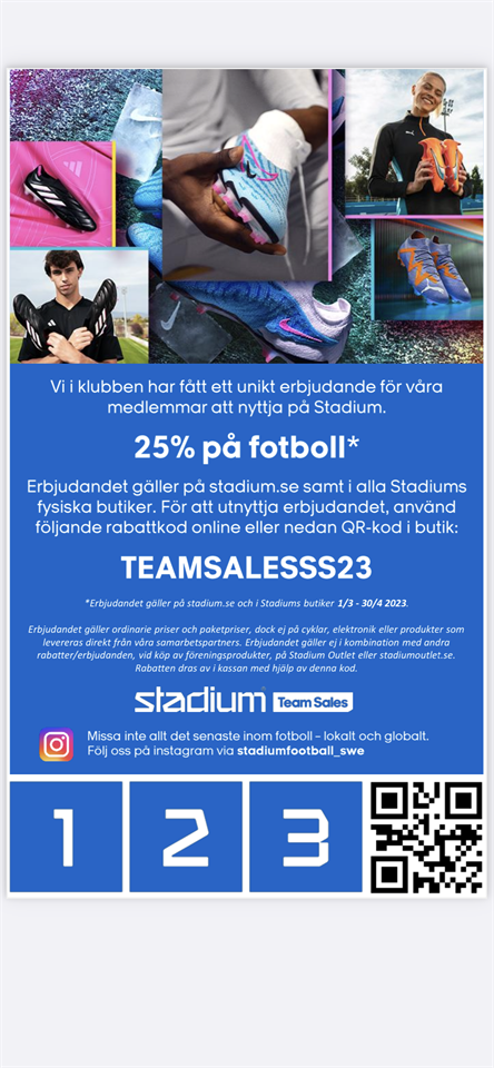 Stadium har skickat ut ett erbjudande där våra medlemmar får 25% rabatt på deras ordinarie priser mellan 1/3-30/4. Erbjudandet gäller både på stadium.se och i Stadiums butiker. För att nyttja erbjudandet använder man sig av bifogad rabattkod om man handlar på nätet, alternativt av QR koden som finns på bilden om man handlar i butik. Perfekt om man till exempel behöver ett par nya dojor inför säsongen. Herr 2 mar 2023 0kommentarer