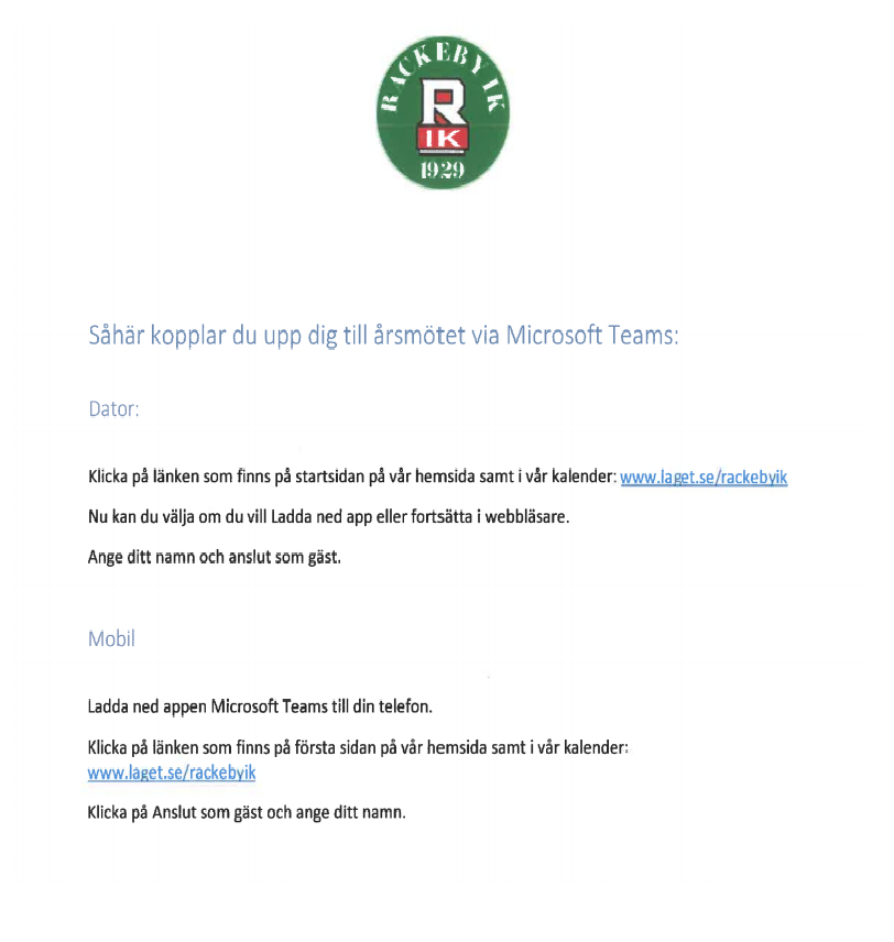 Hej och välkomna till årsmöte 2021! Datum: 23 mars Tid: 19:00 Plats: Teams - https://teams.microsoft.com/l/meetup-join/19%3ameeting_NmQxYzJhYmEtZDczNC00M2RkLThmYTUtYzBmMDM4MWI5ZDlh%40thread.v2/0?context=%7b%22Tid%22%3a%225e3e8418-8c8b-4408-9af5-2e3dc542df82%22%2c%22Oid%22%3a%22f416ac3f-7df1-455c-8768-376b41cee496%22%7d I år har vi fått gå nya vägar och kommer alltså att ha årsmötet online, via appen Teams. Beskrivning på hur man går tillväga kan ni läsa er till i bifogat dokument. Logga gärna in några minuter i förväg ifall ni är nya i Teams så att vi kan starta mötet så snart som möjligt utan datorkrångel. Det ni behöver är en dator eller telefon och bra internet. Har ni frågor kring detta får ni gärna höra av er till mig: 0766 36 56 53 – Sara Appelberg Herr 18 feb 2021 0kommentarer