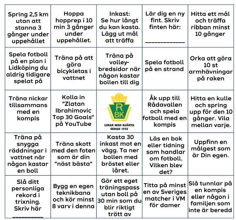 Precis som förra året så finns det möjlighet för fotbollsaktiviteter under sommaruppehållet. Och precis som förra året så kör vi Sommarbingo med diverse olika utmaningar för killarna. Lappen med Sommarbingo har en del av killarna fått på de senaste matcherna, men är det så att ni inte fått en lapp och vill köra bingon så finns följande alternativ. 1. Åk förbi Jesper på Gärdesvägen 16 i Råda och hämta en lapp som finns i den vita brevlådan. 2. Ladda ner dokumentet HÄR så kan man ta och skriva ut lappen själv om man önskar Den ikryssade och ifyllda Bingolappen lämnar man sedan in under starten av höstsäsongen så bjuder vi på glass om man lyckats med minst två bingorader.. P14 4 jul 2023 0kommentarer
