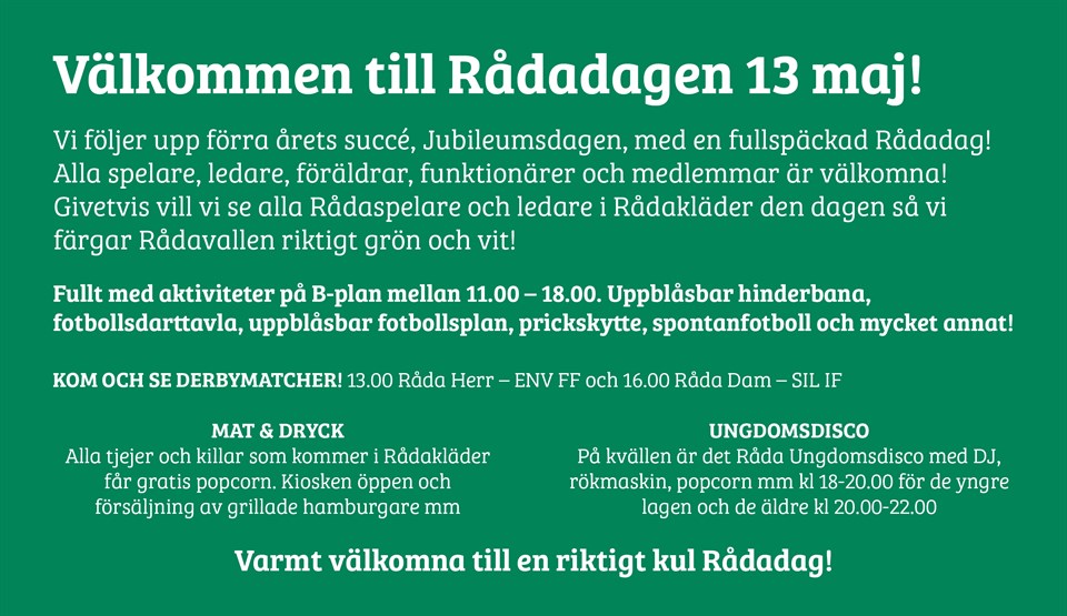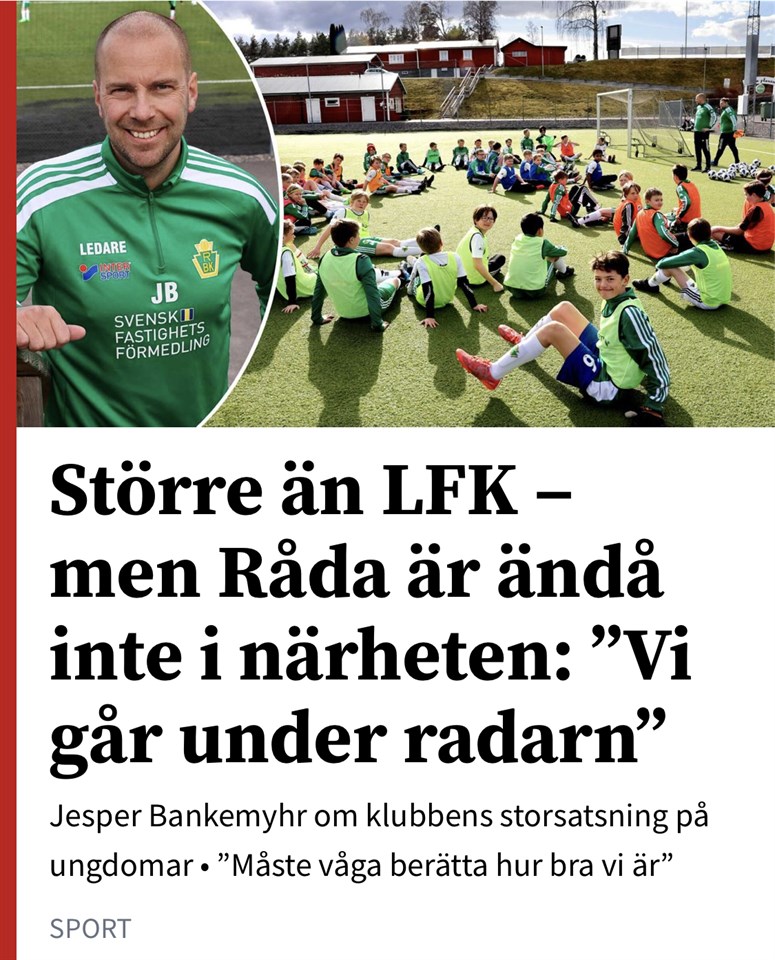 Förra veckan blev en händelserik vecka för Råda BK P12 uppe på Rådavallen. Två träningar och dessutom ett välbesökt Föräldramöte under torsdagen. Otroligt fräckt att se att när P12 tränar och har möte samtidigt så är det cirka 120 personer på Rådavallen! Vidare fick laget också uppmärksamhet i Nya Lidköpings Tidningen när man gjorde ett reportage om Rådas satsning på Ungdomar. Vårt stora lag hamnade då i fokus när vi fotograferades och hamnade på förstasidan. (Klickar ni på Bilder i menyn kan ni läsa hela reportaget från tidningen och se bilderna) Denna Vecka 16 tränar vi återigen två gånger med start redan måndag kväll med fys i Rådaskogen. Lärdomar från förra veckan är att det är otroligt viktigt med mat & dryck-intaget innan träning. Och detta gäller förstås alla träningar. Killarna behöver få i sig något att äta efter skolan i form av mellanmål, men detta mål får absolut inte komma för nära inpå träningen. Var flera killar som senast meddelade att de precis ätit innan träning och därför hade en full mage som inte orkade med fysträningen. Vänligen hjälp era killar med detta och prata om vikten av att äta och dricka rätt för att orka träna och spela så gör vi samma sak. Till sist också stort tack till alla föräldrar och Bollkallar som ställde upp på herr- och damlagsmatcherna i helgen. Ett ovärdeligt arbete för föreningen. Tack! VECKA 16 Måndag 17 april 17:00 - 18:00 Fysträning i Rådaspåret. Joggingskor på. Medtag vattenflaska. Samling på Parkeringen vid Dinaplanen Onsdag 19 april 16:30-17:30 Träning på Dinaplanen. Ombytta och klara med rätt väst på klockan 16:30 P14 17 apr 2023 0kommentarer