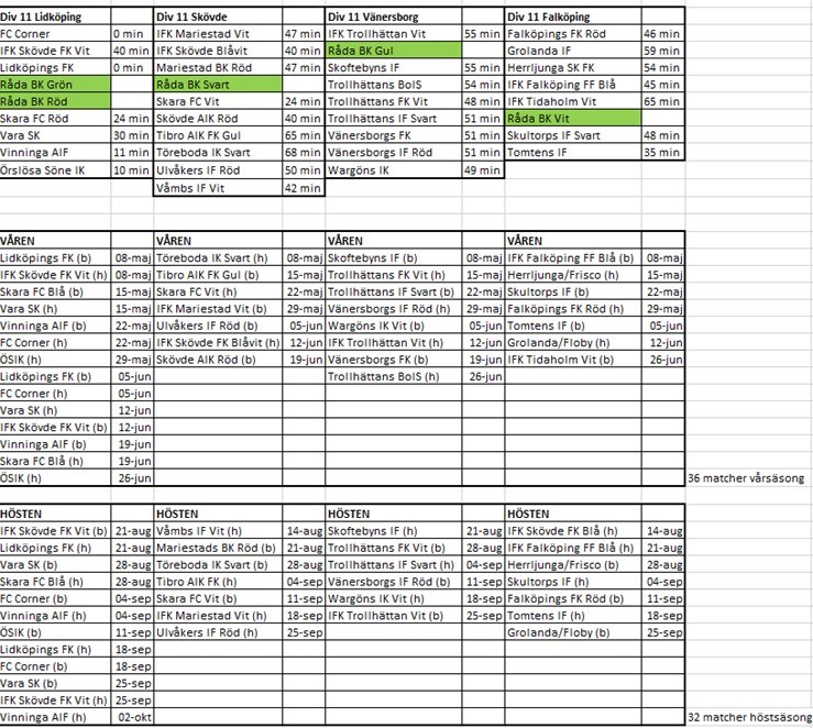 Dags för första Veckobrevet för 2022. Som vanligt kommer detta på måndagar och här kommer info om veckan som kommer samt annat vi ledare vill informera om gällande Råda BK P11. Fotbollssäsongen är nu officiellt här och efter uppskattade Vinterträningar går vi i och med april in i den ordinarie säsongen. Det börjar som bekant med en träning i veckan tills dess att vi får gå på naturgräs. Då väntar det träning två gånger i veckan samt något extrapass på fredagar under vissa veckor. När det kommer till seriematcher så har vi i år anmält fem lag till seriespel och som vanligt kommer vi att dela in killarna i Matchgrupper. Dessa och mer info om alla matcher kommer framöver, men seriespelet drar igång med matcher helgen vecka 18. Närmast på tur är det dock GIFF-Cupen i Tidaholm som spelas den 23-24 april. Anmälan till denna cup gick som bekant ut redan i januari och således är det endast dessa spelare som då anmält sig som kommer vara med på cupen (+ eventuella reserver). All info om Cupen kommer att komma ut i ett sepparat inlägg denna vecka, men det som gäller tidsmässigt är att alla våra lag spelar lördag eftermiddag på Ulvesborg i Tidaholm. (ca 14:30-19:30). Spelplats och vilka tider som gäller på söndagen vet vi först under lördagskvällen efter att alla spelat klart det inledande Gruppspelet. VECKA 14 Tisdag 16:30 - 17:30 Träning på Dinaplanen på Rådavallen. Ombytta och redo för träning 16:30. Anmälan till träningen sker som vanligt via den inbjudan som vi skickat ut.