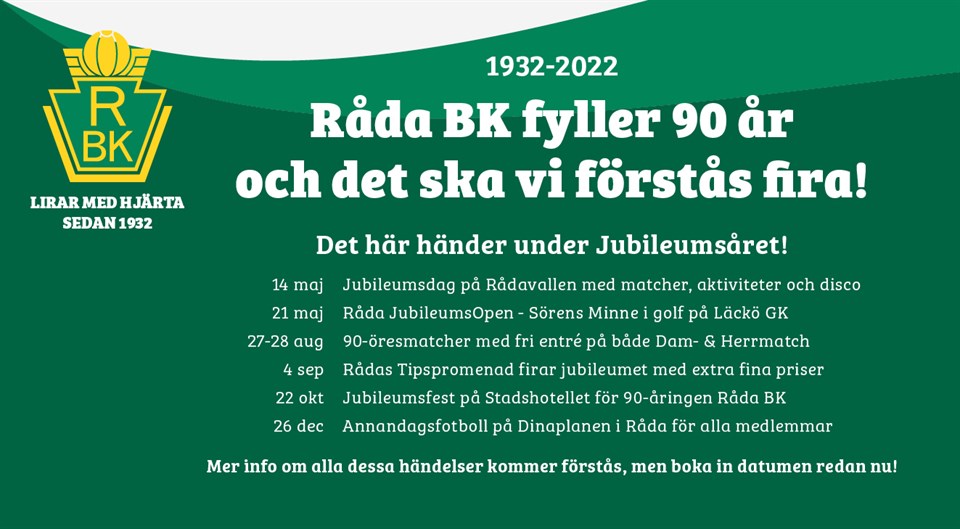 Idag är det ingen vanlig dag - för idag är det Råda BK:s födelsedag. Den 10 februari 1932 bildade några unga grabbar i Råda BK. Allt startade uppe vid Rådas Prästgård där grabbarna vid en närliggande gård sparkade bollar mot ett par logdörrar till sin pappas förtret. Pappan bad dem sluta och istället spela på en närliggande gräsmatta i en hage... På den vägen är det och så här 90 år senare är Råda BK P11 en del av gemenskapen i Råda BK. Idag bedriver vi Lidköpings största ungdomsverksamhet inom idrott. Över 1000 medlemmar har föreningen och cirka 750 aktiva medlemmar med både tjejer och killar. Detta Jubileumsår innebär en rad roliga saker i föreningens regi och på bilden ser ni vad som är att vänta under året. Boka framför allt in den 14 maj i Kalendern då det är Rådadagen på Rådavallen med en massa trevliga aktiviteter.