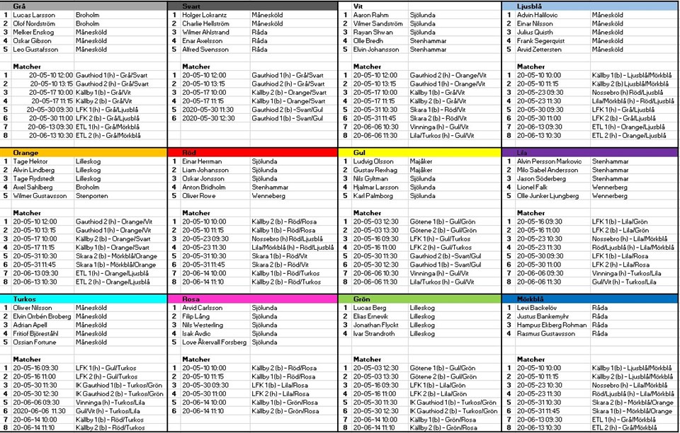 En fullspäckad vår med många matcher. Det är vad som väntar killarna i Råda BK P9. Nedan hittar du allt du behöver veta om vårens alla matchtillfällen. MATCHGRUPPER För att killarna ska få spela med så många lagkompisar som möjligt har vi i år valt att dela upp spelarna i Matchgrupper. Dessa är 12 till antalet och samtliga har namnet efter en färg. Varje Matchgrupp innehåller 4-5 spelare och vid varje matchtillfälle spelar man tillsammans med en annan Matchgrupp. Således blir det 9-10 killar som spelar i ett lag vid varje matchtillfälle. De spelare som är inplacerade i Matchgrupperna är de som än så länge visat sig på våra träningar. Dyker det upp nya ansikten placerar vi in dessa allt eftersom. Alla Matchgrupper, datum och tider hittar du om du klickar HÄR ANTAL MATCHER Varje spelare kommer att få spela matcher vid minst tre tillfällen under våren. Då förbundet inte själva arrangerar några Poolspel är det vi ledare som fått fixa alla matcher och vi gör vårt yttersta för att det ska bli så rättvist som möjligt. Fler matcher än de nu planerade kan bli verklighet och då får självklart de som fått någon match mindre i förstaläget att få åka på dessa. SPELFORM OCH TID Vi är nu inne på sista året med 5 mot 5 och detta kommer vi att spela under våren. Matchtiden kommer att variera från tillfälle till tillfälle, men vi siktar på att försöka spela 3 x 15 minuter. KALLELSE TILL MATCH Inför varje matchtillfälle kommer det ut en kallelse via mail från laget.se. På denna svarar du om ditt barn kan komma på matchen. ÅTERBUD Lämna eventuella återbud via kallelsen som du får och gör detta så snart du har möjlighet så vi ledare kan kalla in ersättare. Om du ska lämna återbud kvällen innan match eller under matchdag så är det via telefon eller sms till den ledare som ska åka med laget. Vem eller vilka det är kommer att stå här på hemsidan innan helgens matcher. SAMLING INFÖR MATCH Var noga med att komma i tid till samlingen. På hemmamatcherna samlas vi alltid på Rådavallen och när det är lite längre bortamatcher på parkeringen vid Sparbanken Lidköping Arena. Samlingsplatsen hittar du alltid i kallelsen till match. KOM OMBYTT TILL SAMLING Oavsett om det är hemmamatch eller bortamatch så kom ombytt till samlingen. Gröna shorts, vita strumpor, benskydd och namnad vattenflaska är obligatorisk. Matchtröjorna tar ledarna med sig och dessa fås på plats. Tänk också på att ha med överdragskläder då det i dessa tider inte är säkert att vi får tillgång till omklädningsrum på alla matcharenor. NÅGOT ATT ÄTA Då det blir mycket spel och ett par pauser kan det vara bra att ha med sig en frukt och/eller en smörgås till matchtillfället. Godis eller läsk är inte tillåtet att ta med sig till match. FÖRÄLDRAR PÅ MATCH Då vi följer de riktlinjer som Svenska Fotbollförbundet givit oss undanbeder vi foss öräldrar på match. Vi behöver dock er föräldrars hjälp med att skjutsa era barn till matcherna, men väl på plats rekommenderar vi att man bara lämnar av sitt barn, tar en promenad eller åker hem i väntan på att man hämtar sitt barn efter avslutade matcher. Vi förstår att detta är jättetråkigt, men ber er respektera rådande samhällsläge.