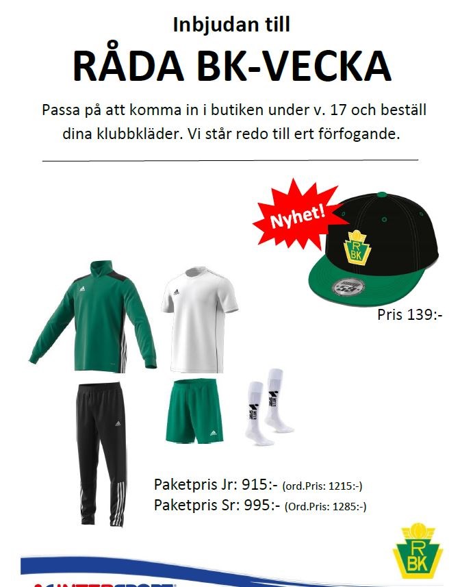 Under vecka 17 är det Rådavecka på Intersport. Bara att gå in till Intersport i Lidköping så hjälper dem dig att hitta rätt bland alla Rådaprylar. Glöm inte att det är gröna shorts och vita strumpor som gäller att ta med sig själv till Poolspelen framöver. Eftersom första Poolspelet är redan 5 maj kan det vara läge att gå in till Intersport och fixa detta under vecka 17.