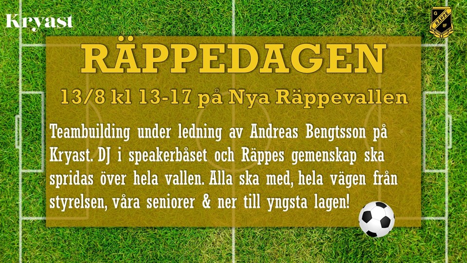 Ett stort tack till alla spelare, föräldrar och oss ledare för en härlig fotbollssäsong 2022. Detta är säsongen som vi invigt vår nya Räppevall, det är säsongen som vi i F15 spelat våra första cuper, vi har haft Räppedagen och vi har startat vår egen lagkassa genom en imponerande insats i NewBodyförsäljningen och vi har genomfört många träningar ihop, både med P15 och under hösten med F14. Sista träningen för denna säsong på Räppevallen är idag 2/10 kl 16 - 17. Vi hoppas såklart att så många som möjligt kan närvara för att säga hej och tack. Det blir ett kort informationsmöte till föräldrar som är på plats där ni gärna får ge oss ledare input. Vi pausar nu träningarna i F15 för att ge alla tjejer utrymme och tid till att utöva andra aktiviteter och vinteridrott och dialog förs med F14 för en planering för 2023. Vår ambition är att F15 är kvar som lag och att vi kan locka till oss fler tjejer till nästa säsong, men för att bereda bra träningsförutsättningar så planerar vi för gemensamma träningar med andra tjejlag i föreningen. Om det är några tjejer som vill hålla igång fotbollen under höst/vinter så finns det möjlighet att träna ihop med P15 en gång i veckan på PL konstgräsplan på torsdagar kl 17.30-18.30. Vi återkommer med när första träningstiden är planerad. Tack från oss ledare! Ledarna i F15